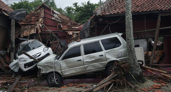 وضربت موجات تسونامي سواحل مضيق سوندا في غرب إندونيسيا يوم السبت في تمام الساعة 21:27 بالتوقيت المحلى. ولازال الإخلاء مستمر، ودمر مئات المباني والمنازل.