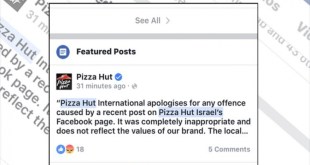 فيلادلفيا نيوز اعتذرت شركة بيتزا هت العالمية الثلاثاء عن الإعلان المسيء لإضراب الأسرى الفلسطينيين، الذي ظهر مؤخرا على النسخة الإسرائيلية من صفحتها على فيسبوك. وجاء هذا الاعتذار بعد أن قادت الناشطة الإسبانية ماري فيرنانديز حملة عالمية لمقاطعة الشركة. وأوضحت الشركة في بيان على صفحتها الرسمية العالمية أن الإعلان كان …