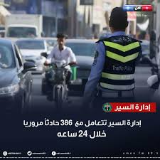 تعاملت إدارة السير مع 386 حادثا مروريا في المملكة خلال الساعات الـ24 الماضية، منها 288 حادث في عمان نتج عنها 9 إصابات ، و98 حوادث في المحافظات نتج عنها 10 إصابات ووفاه واحده .