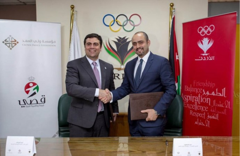 -وقعت مؤسسة ولي العهد ممثلةً بمديرها التنفيذي عمر المصاروه واللجنة الاولمبية ممثلةً بأمينها العام ناصر المجالي السبت اتفاقيّة عمل مشترك تتولى بموجبها اللجنة الأولمبيّة الإشراف على تنفيذ أعمال مبادرة قصي التابعة لمؤسسة ولي العهد، والهادفة لتأهيل وتدريب واعتماد كوادر الطب الرياضي للتعامل مع أي طارئ أو إصابة قد يتعرض لها اللاعبين أثناء ممارستهم للتمارين الرياضية أو أثناء مشاركتهم في البطولات والمحافل الرياضية المحليّة والدوليّة.